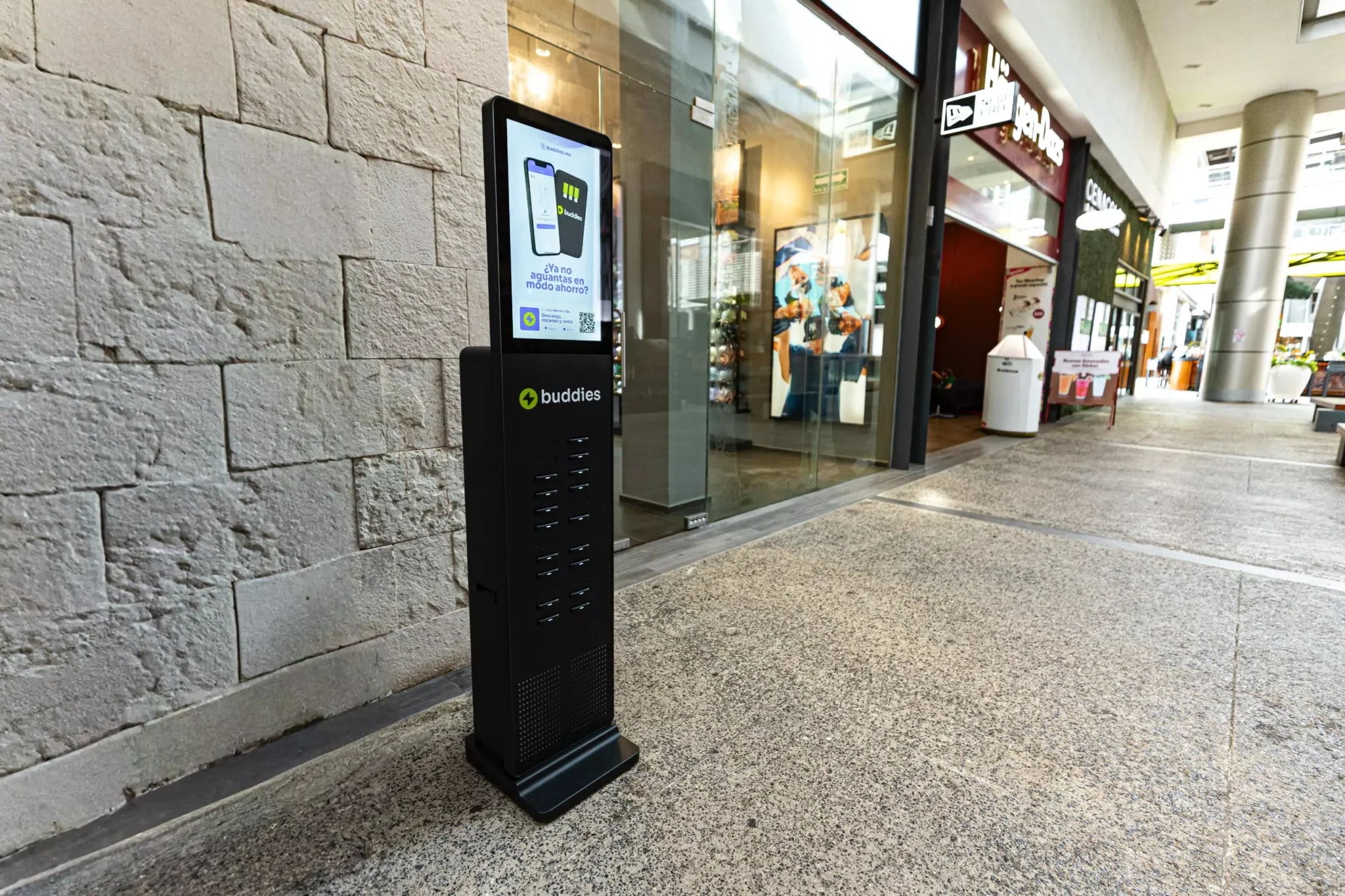 En Buddies, cada estación carga dispositivos y proyecta tu marca en pantallas digitales ubicadas en puntos de alto tráfico como aeropuertos, centros comerciales, universidades, restaurantes y eventos.